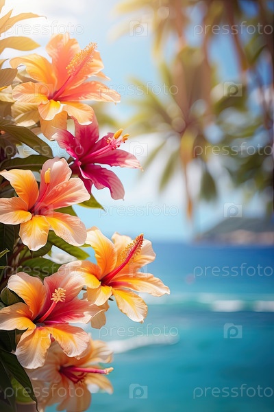 Вертикальный тропический пляж с букетом цветов, голубой водой на горизонте и открытым копировальным пространством для летнего рекламного текста или рекламы
