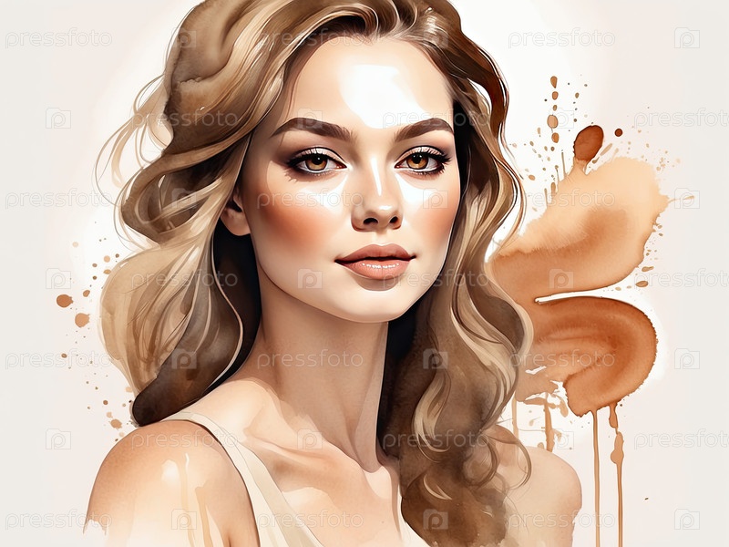 Акварельная иллюстрация женщины с мягким фундаментом и персиковой кожей, нежный стиль макияжа, косметика, сияющий здоровый цвет лица, искусство красоты
