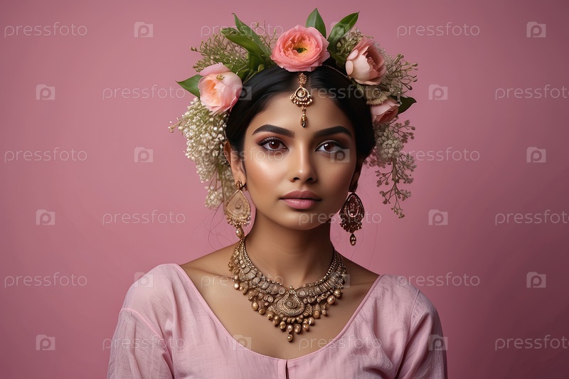 Индийская женщина с прической и цветочной короной, розовый фон, портрет весенней красавицы, нежная женственность, традиция, 8 марта, женский день