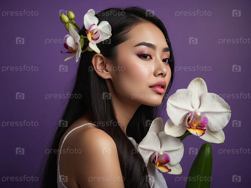Тайская женщина с темными волосами и орхидеей, портрет азиатской красоты, спа-центр, оздоровление, тайский массаж, элегантность, гладкая кожа