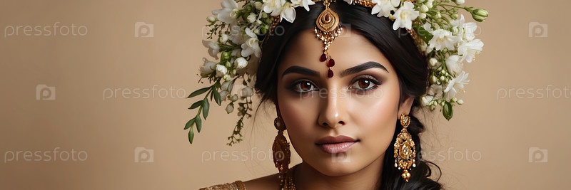 Индийская женщина с светло-золотым платьем и белой цветочной короной, бежевый фон, портрет весенней красоты, традиция, женская элегантность, 8 марта, женский день