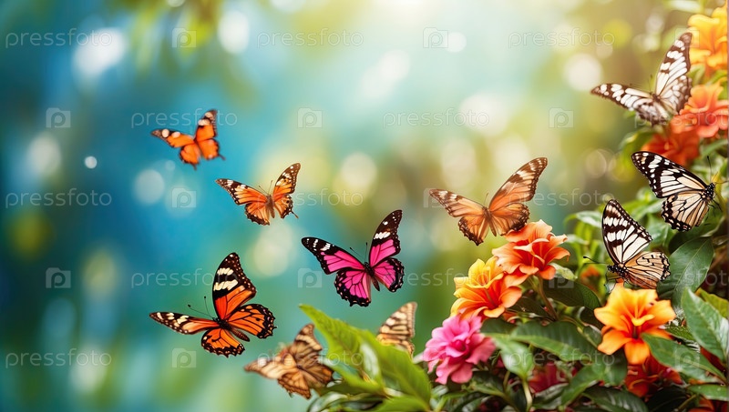 Горизонтальный баннер с бабочками, тропическими цветами, зеленым летним садом, открытым копировальным пространством для текста или продажи