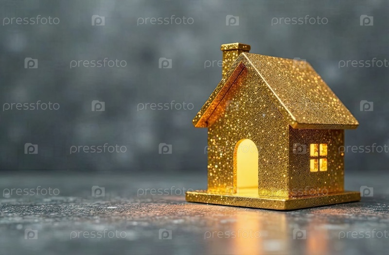 Золотой символ дома на сером бетонном фоне с золотым блеском. недвижимость, риэлторская деятельность, ипотека, страхование, бронирование, строительство, изоляция, отопление. ИИ генерируется
