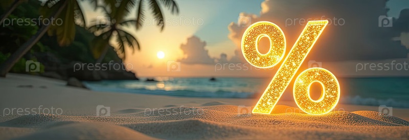 Яркий золотой процентный знак на берегу моря с тропическими пальмами в свете солнца, туристический морской фон. жаркая летняя распродажа и скидки, горящий тур-баннер, флаер. ИИ генерируется