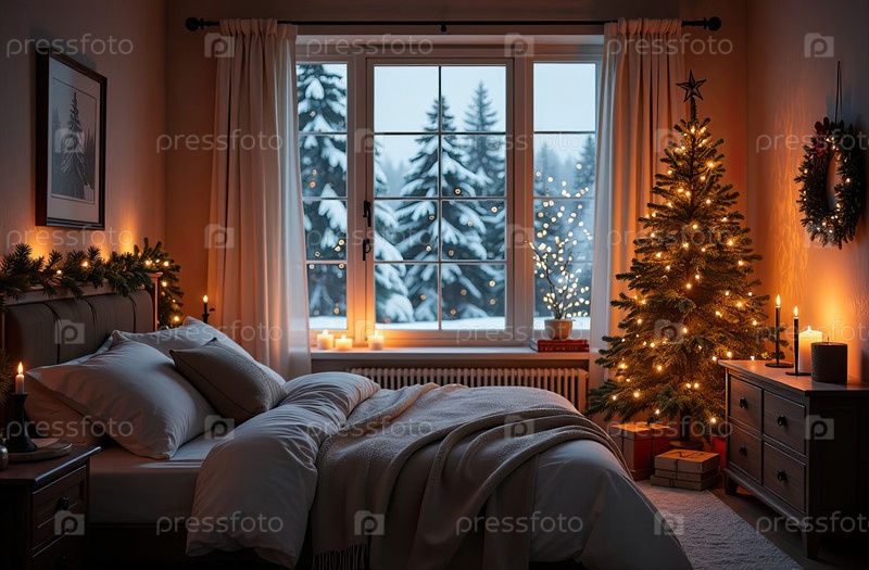 Уютная спальня с кроватью у окна с рождественским декором и елкой, теплыми гирляндами света и свечами - вид изнутри зимой и снегом. Отпразднуйте Рождество и Новый год, рождественское настроение. ИИ генерируется