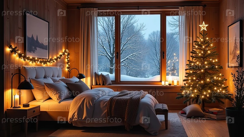 Уютная спальня с кроватью у окна с рождественским декором и елкой, теплыми гирляндами света и свечами - вид изнутри зимой и снегом. Отпразднуйте Рождество и Новый год, рождественское настроение. ИИ генерируется