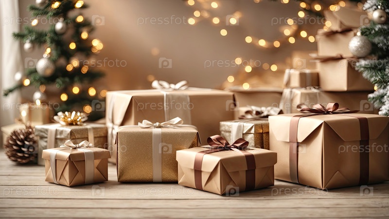 Рождественский фон с подарочными коробками с луками в нейтральных тонах естественного эко-стиля, боке и фейри-светом, рождественская елка во внутреннем интерьере дома. праздничное настроение Рождество и Новый год, открытка, созданный ИИ