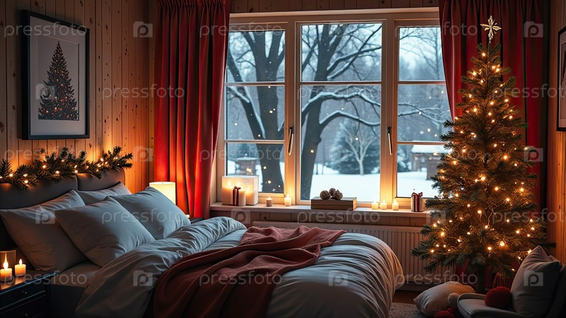 Уютная спальня с кроватью у окна с рождественским декором и елкой, теплыми гирляндами света и свечами - вид изнутри зимой и снегом. Отпразднуйте Рождество и Новый год, рождественское настроение. ИИ генерируется