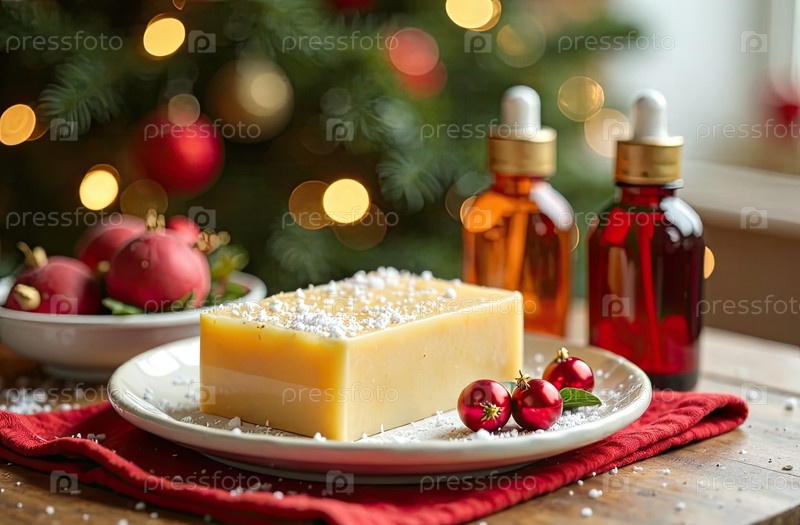 Ручно сделанное натуральное эко мыло на столе с бутылками с ароматизатором, красителем и основой для мыла на рождественском фоне. Подарок, подарок, ремесло на Новый год и Рождество. Производство любительского мыла, домашнее изготовление. ИИ генерируется;