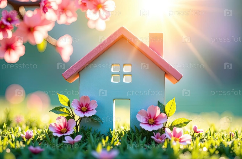 Крошечный дом в солнечных лучах, украшен весенними пастельными цветами на весеннем пастельно-синем фоне. недвижимость, риэлтор, ипотека, страхование, бронирование, строительство, изоляция. ИИ генерируется