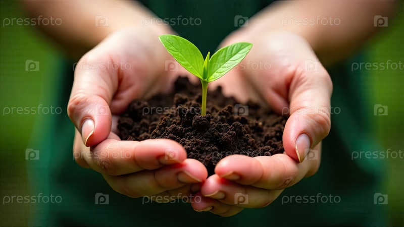 Молодой зеленый побег в горстке земли в ладонях фермера растений в земле на близком расстоянии