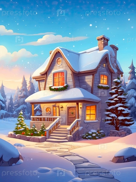 Мультфильм Уютный деревянный дом в горах ночью с рождественскими елками и подарками зимой на снегу и снегопаде с Рождественским декором - праздничная открытка
