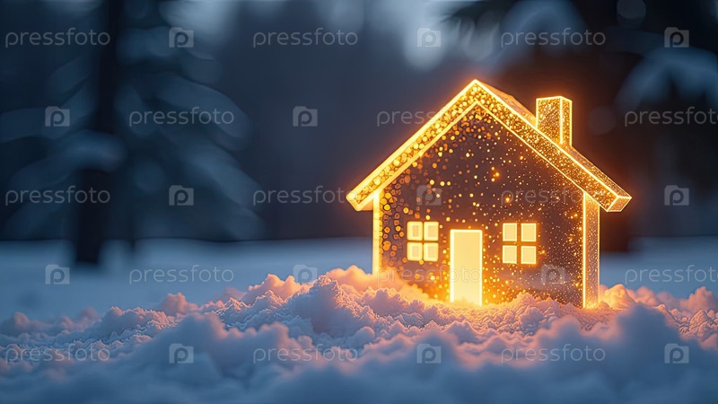 Прозрачное золото светящийся символ дома на снегу и заснеженном фоне с золотым блеском. недвижимость, риэлтор, ипотека, страхование, бронирование, зимовка, изоляция, отопление. ИИ генерируется