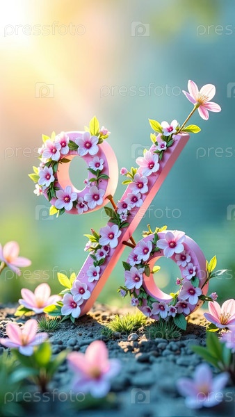 Процентный знак в солнечных лучах, украшен весенними пастельными цветами.Весенние распродажи и скидки, 8 марта, Пасха, баннер женского дня, флаер с копировальным пространством. ИИ генерируется