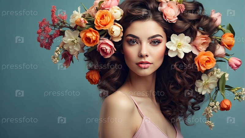 Брюнетка с гламурными локонами и оранжевой цветочной короной, зеленый фон, весенний цветочный портрет, женственность, обаяние, уверенность в себе, 8 марта, женский день