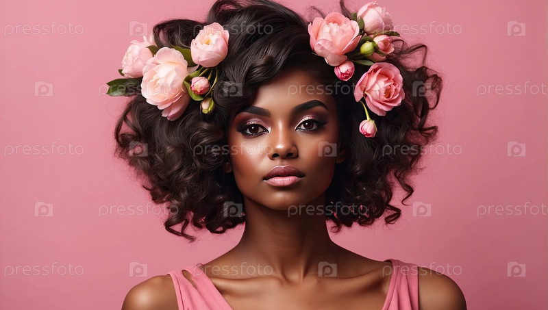 Черная женщина с кудрявыми волосами и цветочной короной, портрет весенней красавицы, розовый фон, женственность, празднование цветков, 8 марта, женский день