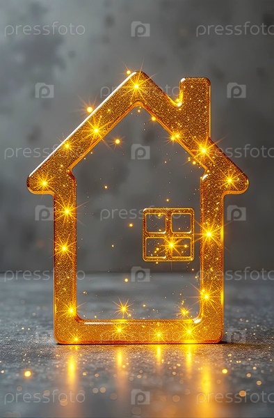 Прозрачное золото светящийся символ дома на сером бетонном фоне с золотым блеском. недвижимость, риэлтор, ипотека, страхование, бронирование, строительство, изоляция, отопление. ИИ генерируется