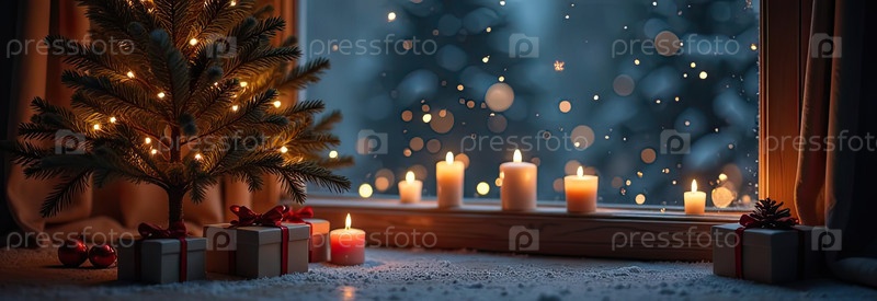 Внутреннее уютное окно с рождественским декором и теплыми световыми гирляндами и свечами - внутренний вид зимой и снегом со спасом для текста. Отпразднуйте Рождество и Новый год, елку, боке. ИИ генерируется