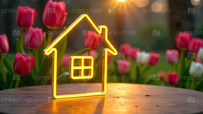 Прозрачное золото светящийся символ дома стол с весенним цветущим солнечным фоном. недвижимость, риэлторская деятельность, ипотека, страхование, бронирование, строительство, изоляция. AI generated