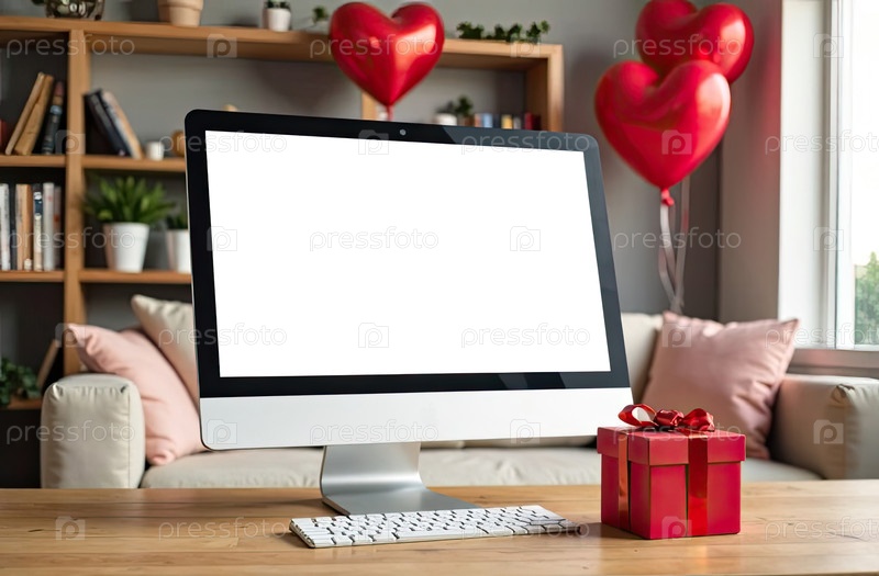 Компьютерный монитор с белым экраном макет на столе в уютном домашнем офисе с красными шарами в форме сердца, подарок, горшочные растения, книжная полка. День святого Валентина подарок, дата, романтика. ИИ генерируется
