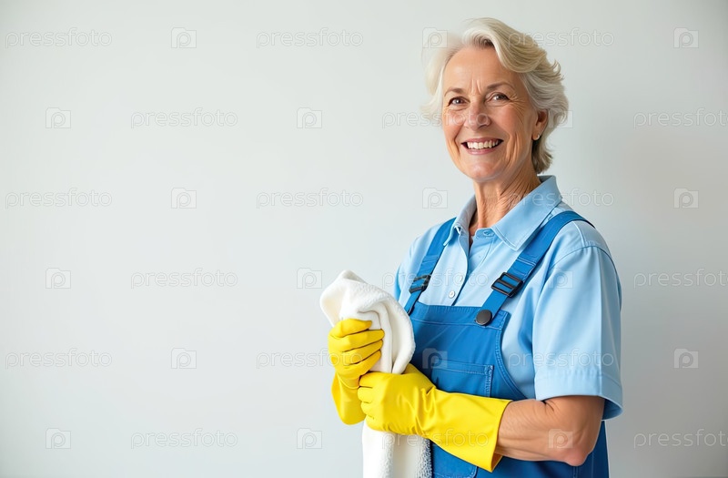 Портрет взрослой белокожей женщины в синем фартуке и желтых резиновых перчатках с тряпкой в руке возле белой стены со свободным местом для текста, услуги очистки окон, уборки дома, горничной