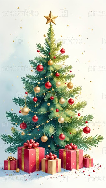Акварельная зеленая рождественская елка и коробки для подарков на сияющем фоне.Поздравление к Рождеству и Новому году.Искусственный интеллект создан