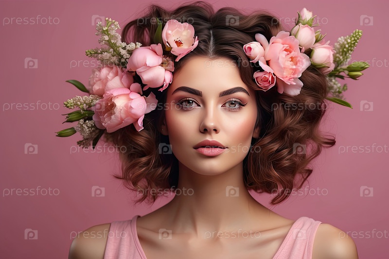 Брюнетка с большими розовыми цветами в объемных волосах, весенний цветочный портрет, женская красота, флористика, романтика, 8 марта, женский день