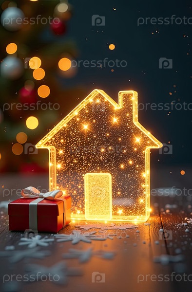 Прозрачное золото светящийся символ дома и коробка для подарков под елкой на рождественском фоне с золотым блеском