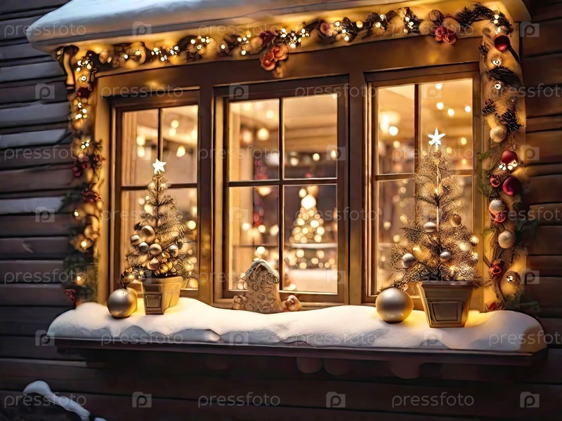 Уютное окно с рождественским декором и теплым светом внутри - вид снаружи дома. отпразднуйте Рождество и Новый год, елку, боке, снег. ИИ генерируется