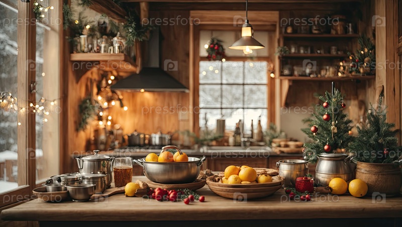 Уютная деревенская кухня с рождественским декором, новогоднее настроение, подготовка к празднику, посуда.Счастливого Рождества и счастливого Нового года поздравительную карточку, тепло дома.Искусственный интеллект генерирует