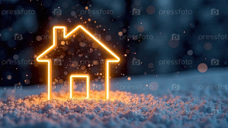 Прозрачное золото светящийся символ дома на снегу и заснеженном фоне с золотым блеском. недвижимость, риэлтор, ипотека, страхование, бронирование, зимовка, изоляция, отопление. ИИ генерируется