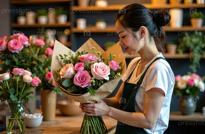 Букет роз и весенних цветов в руках флориста, упакованный в крафт-бумагу в интерьере цветочного магазина, доставка на праздник.Весна, 8 марта, женский день, день рождения. ИИ сгенерировано