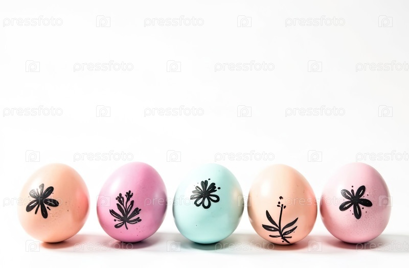 Внизу изображения пять яиц со свободным пространством сверху для текста, творческий цветочный черный рисунок на цветах-яйцах, белый фон. Пасхальный баннер с пробелом для текста. ИИ генерируется