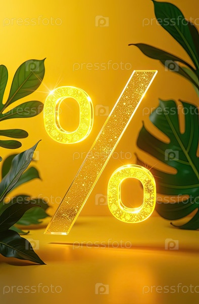 Яркий золотой процентный знак на желтом фоне с пальмами и тропическими растениями. жаркая летняя распродажа и скидки, горящий туристический баннер, флаер. ИИ генерируется