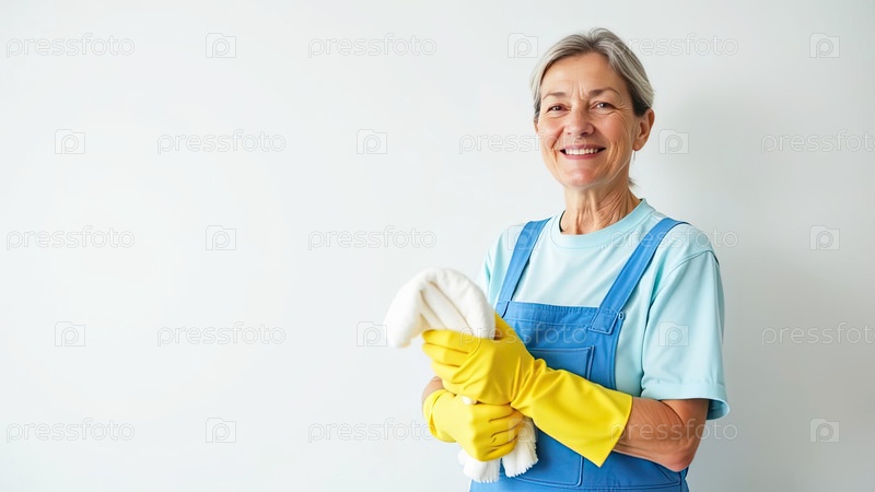 Портрет взрослой белокожей женщины в синем фартуке и желтых резиновых перчатках с тряпкой в руке возле белой стены со свободным местом для текста, услуги очистки окон, уборки дома, горничной