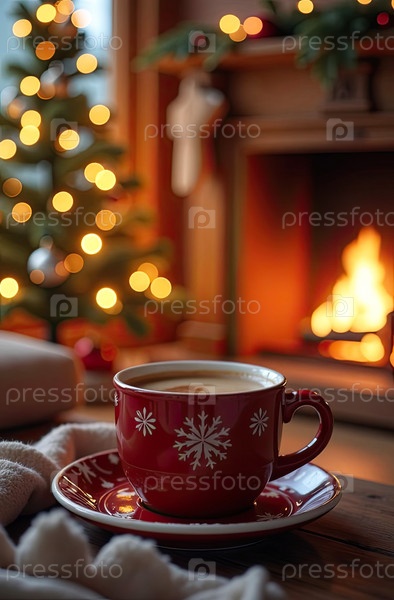 Теплая чашка кофе возле камина в уютном теплом трикотажном платье и рождественский декор.Уютная зима, Рождество, Новый год. ИИ генерируется