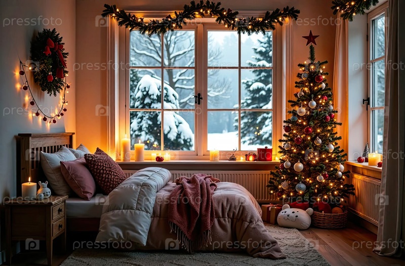Уютная спальня с кроватью у окна с рождественским декором и елкой, теплыми гирляндами света и свечами - вид изнутри зимой и снегом. Отпразднуйте Рождество и Новый год, рождественское настроение. ИИ генерируется