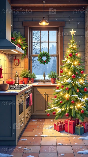 Рустический интерьер уютной рождественской кухни, новогоднее настроение, подготовка к празднику, посуда. Рождественский декор снежной кухни с приготовленным ужином. ИИ генерируется