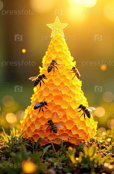 Мед в сосудах в форме конуса рождественской елки с пчелами на летнем поле под солнечным светом.Пчеловодство, Рождество, Новый год.Искусственный интеллект создан