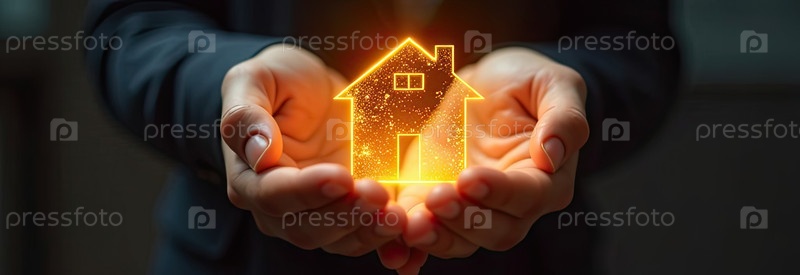 Золото светящийся символ уютного дома В ладонях рук с золотым блеском. Недвижимость, риэлтор, ипотека, страхование, бронирование, изоляция, мечта о собственном доме. ИИ генерируется