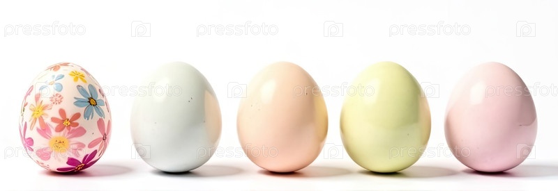 В нижней части изображения пять яиц со свободным пространством сверху для текста, креативный цветочный пастельный печат на цветах яйца, белый фон. Пасхальный баннер с пробелом для текста. ИИ генерируется