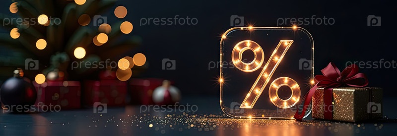 Неон светящийся золотой процентный знак на рождественском фоне с елкой, блесками и коробками для подарков. Черная пятница, Новый год, Рождественская распродажа, скидки. баннер, флаер с копировальным пространством. ИИ генерируется