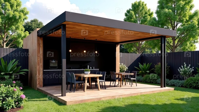 Газебо с зоной для барбекю во дворе дома с барбекью, плитой, столом, крышей