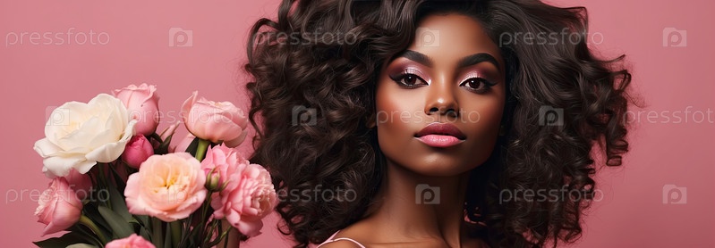 Черная женщина со свободными локонами и мягким цветочным украшением, розовый фон, портрет весенней красоты, женственность, нежная сила, 8 марта, женский день
