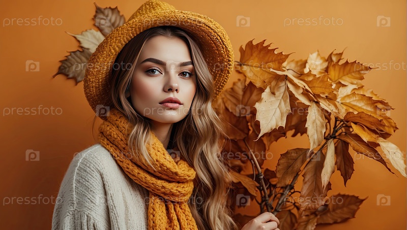 Белая женщина с шарфом и осенними листьями, уютный портрет сезонной красоты, осеннее настроение, нежное тепло
