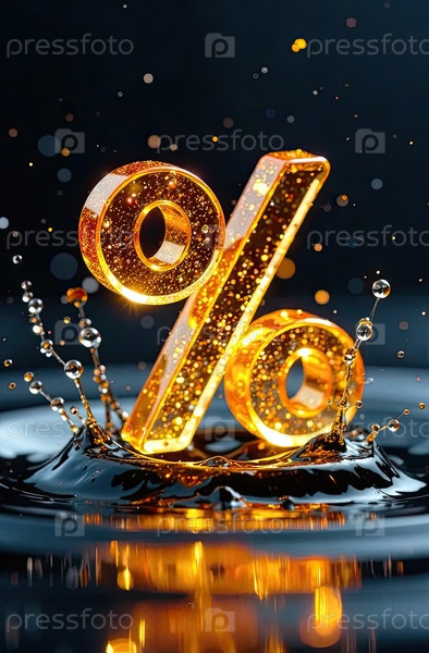 Светящийся золотой процентный знак в освежающем брызге воды над водой. жаркие летние распродажи и скидки, горящие баннеры туров, листовки. ИИ генерируется