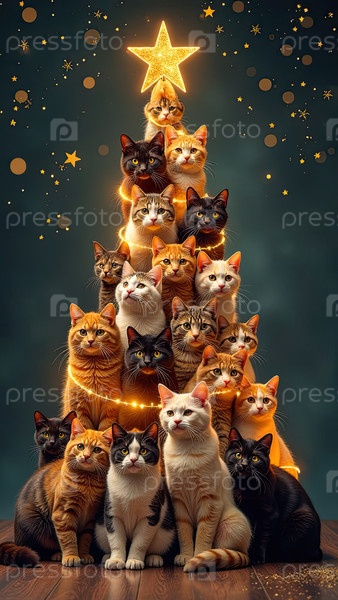 Рождественская елка из кошек сделана на праздничном фоне с блеском, многоцветная сотни котов складываются в форме высокой рождественской елки с золотыми светящимися гирляндными огнями