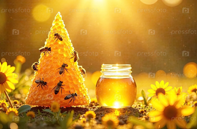 Мед в сосудах в форме конуса рождественской елки с пчелами на летнем поле под солнечным светом.Пчеловодство, Рождество, Новый год.Искусственный интеллект создан