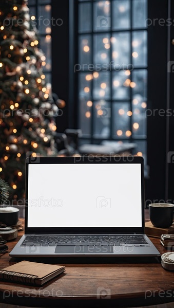 Ноутбук с белым экраном макет на столе в офисе рождественского декора с огнями боке, свечами, сверхурочной работой по праздникам, домашний офис, черная пятница,