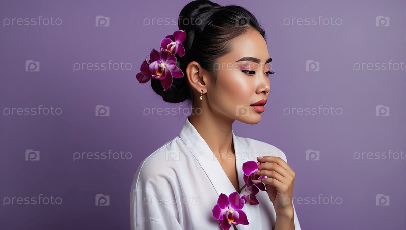 Тайская женщина с боковой булочкой и цветочным аксессуаром, портрет азиатской красавицы, спа-центр, фокус тайского массажа, элегантность